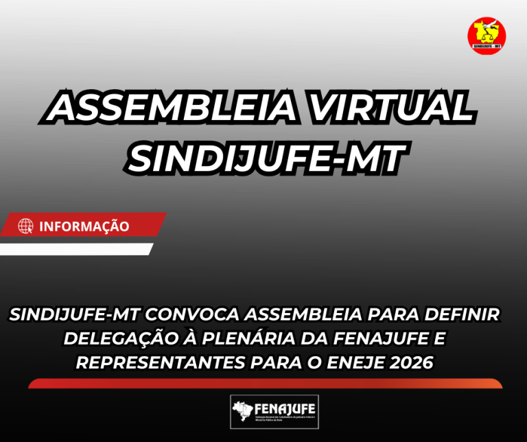 SINDIJUFE-MT CONVOCA ASSEMBLEIA PARA DEFINIR DELEGAÇÃO À PLENÁRIA DA FENAJUFE E REPRESENTANTES PARA O ENEJE 2026 14 de janeiro de 2026 Nenhum comentário Leia mais »