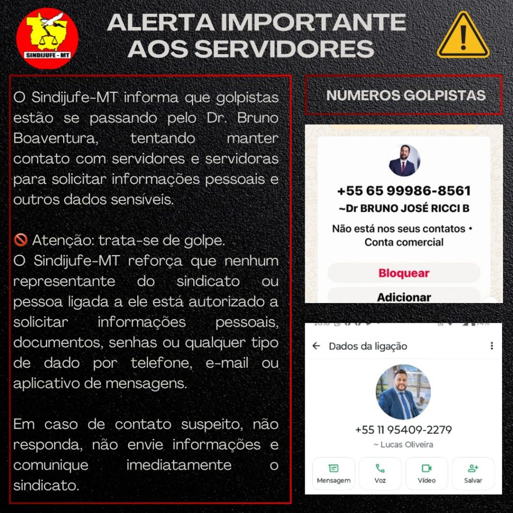 O Sindicato dos Servidores do Poder Judiciário Federal em Mato Grosso (Sindijufe-MT) emitiu um alerta importante aos servidores e servidoras após identificar tentativas de golpe envolvendo o uso indevido do nome do Dr. Bruno Boaventura. De acordo com a entidade, golpistas estão entrando em contato com servidores, solicitando informações pessoais e dados sensíveis.