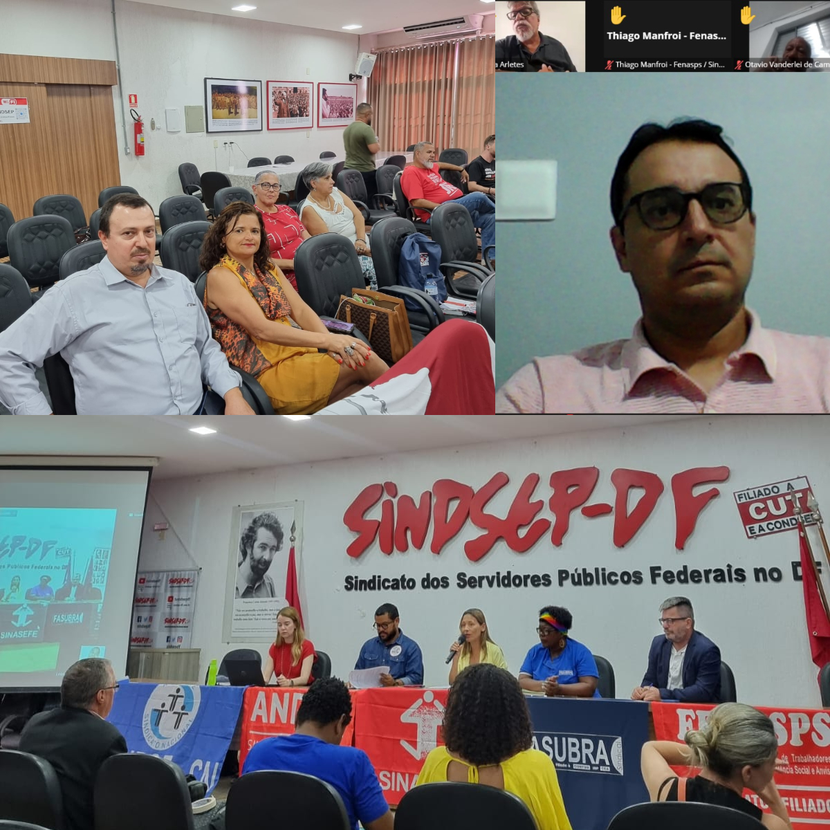 Presencialmente, participaram a coordenadora Luciana Carneiro e o coordenador Fabricio Loguercio, que estão de plantão nesta semana. No virtual, a coordenadora Denise Carneiro e o coordenador Manoel Gérson, do Sindjufe/BA e do Sintrajufe/PE, respectivamente.