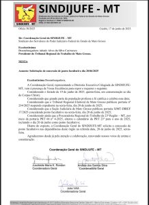 A entidade sindical reforça seu compromisso com a valorização dos servidores do Judiciário Federal e segue atuando de forma propositiva para garantir condições de trabalho dignas, respeitando as práticas já adotadas por outras instituições do sistema de Justiça em Mato Grosso. O sindicato aguarda deferimento do pedido e agradece a atenção da Administração do TRT-MT, reiterando os votos de estima e consideração.