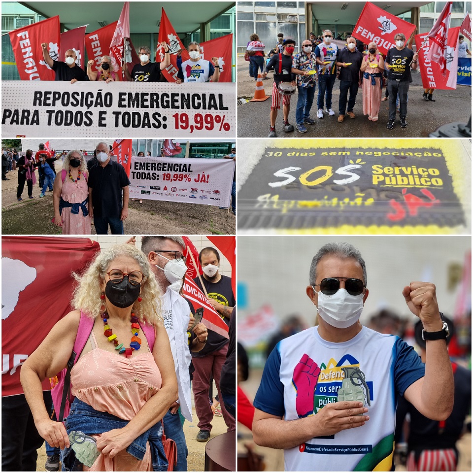 Os manifestantes repudiaram a falta de resposta do governo em dialogar com as categorias do serviço público. O período de silêncio evidencia negligência escancarada governista com o conjunto dos servidores. Um bolo representando um mês sem resposta foi repartido entre os participantes.